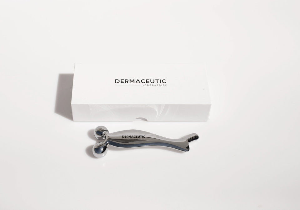Inspired by professional techniques, the Dermaceutic metallic facial roller combines ergonomic design with scientific precision to deeply stimulate the skin.